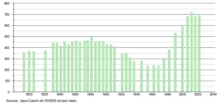 L'évolution du nombre d'habitants est connue à travers les recensements de la population effectués dans la commune depuis 1793. Pour les communes de moins de 10 000 habitants, une enquête de recensement portant sur toute la population est réalisée tous les cinq ans, les populations légales des années intermédiaires étant quant à elles estimées par interpolation ou extrapolation[20]. Pour la commune, le premier recensement exhaustif entrant dans le cadre du nouveau dispositif a été réalisé en 2006[21].
