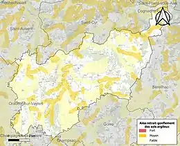 Le retrait-gonflement des sols argileux est susceptible d'engendrer des dommages importants aux bâtiments en cas d’alternance de périodes de sécheresse et de pluie[17]. 20,1 % de la superficie communale est en aléa moyen ou fort (27 % au niveau départemental et 48,5 % au niveau national métropolitain)[Carte 2]. Depuis le , en application de la loi ÉLAN, différentes contraintes s'imposent aux vendeurs, maîtres d'ouvrages ou constructeurs de biens situés dans une zone classée en aléa moyen ou fort[Note 3],[18].
