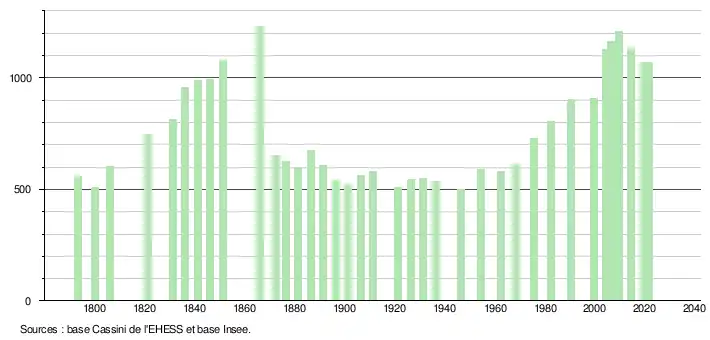 L'évolution du nombre d'habitants est connue à travers les recensements de la population effectués dans la commune depuis 1793. Pour les communes de moins de 10 000 habitants, une enquête de recensement portant sur toute la population est réalisée tous les cinq ans, les populations légales des années intermédiaires étant quant à elles estimées par interpolation ou extrapolation[22]. Pour la commune, le premier recensement exhaustif entrant dans le cadre du nouveau dispositif a été réalisé en 2004[23].