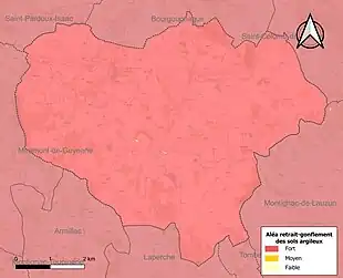 Le retrait-gonflement des sols argileux est susceptible d'engendrer des dommages importants aux bâtiments en cas d’alternance de périodes de sécheresse et de pluie[20]. La totalité de la commune est en aléa moyen ou fort (91,8 % au niveau départemental et 48,5 % au niveau national)[Carte 2]. Depuis le , en application de la loi ELAN, différentes contraintes s'imposent aux vendeurs, maîtres d'ouvrages ou constructeurs de biens situés dans une zone classée en aléa moyen ou fort[Note 3],[21].