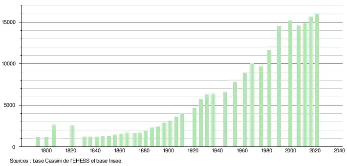 - Par convention dans Wikipédia, le principe a été retenu de n’afficher dans le tableau des recensements et le graphique, pour les populations légales postérieures à 1999, que les populations correspondant à une enquête exhaustive de recensement pour les communes de moins de 10 000 habitants, et que les populations des années 2006, 2011, 2016, etc. pour les communes de plus de 10 000 habitants, ainsi que la dernière population légale publiée par l’Insee pour l'ensemble des communes.
