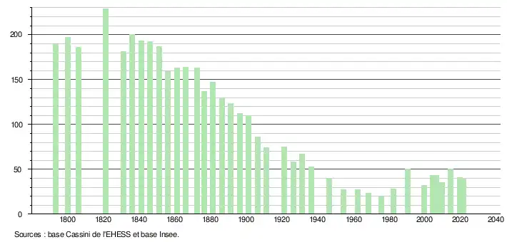 L’histoire démographique de Saint-Lions est marquée par une période d’« étale » où la population reste relativement stable à un niveau élevé. Cette période dure toute la première moitié du XIXe siècle. L’exode rural provoque ensuite un mouvement de baisse de la population de longue durée. Dès 1901, la commune enregistre la perte de plus de la moitié de sa population par rapport au maximum historique de 1821[41]. Le mouvement de baisse arrive à un plancher dans les années 1970. Depuis, la population oscille entre trente et cinquante habitants.
