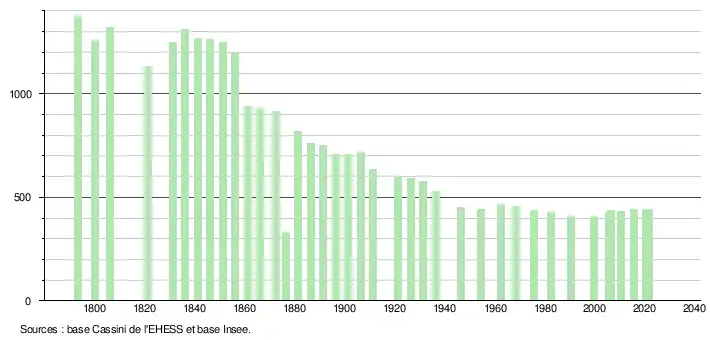 | L'évolution du nombre d'habitants est connue à travers les recensements de la population effectués dans la commune depuis 1793. Pour les communes de moins de 10 000 habitants, une enquête de recensement portant sur toute la population est réalisée tous les cinq ans, les populations légales des années intermédiaires étant quant à elles estimées par interpolation ou extrapolation[20]. Pour la commune, le premier recensement exhaustif entrant dans le cadre du nouveau dispositif a été réalisé en 2005[21]. En 2021, la commune comptait 442 habitants[Note 3], en diminution de 0,23 % par rapport à 2015 (Landes : +4,9 %, France hors Mayotte : +1,84 %). |