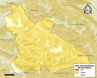 Le retrait-gonflement des sols argileux est susceptible d'engendrer des dommages importants aux bâtiments en cas d’alternance de périodes de sécheresse et de pluie. 89,5 % de la superficie communale est en aléa moyen ou fort (19,2 % au niveau départemental et 48,5 % au niveau national). Sur les 244 bâtiments dénombrés sur la commune en 2019, 209 sont en aléa moyen ou fort, soit 86 %, à comparer aux 17 % au niveau départemental et 54 % au niveau national. Une cartographie de l'exposition du territoire national au retrait gonflement des sols argileux est disponible sur le site du BRGM[18],[Carte 2].