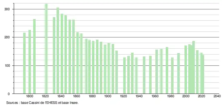 L'évolution du nombre d'habitants est connue à travers les recensements de la population effectués dans la commune depuis 1793. Pour les communes de moins de 10 000 habitants, une enquête de recensement portant sur toute la population est réalisée tous les cinq ans, les populations légales des années intermédiaires étant quant à elles estimées par interpolation ou extrapolation[20]. Pour la commune, le premier recensement exhaustif entrant dans le cadre du nouveau dispositif a été réalisé en 2004[21].