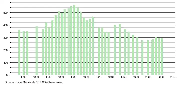 L'évolution du nombre d'habitants est connue à travers les recensements de la population effectués dans la commune depuis 1793. Pour les communes de moins de 10 000 habitants, une enquête de recensement portant sur toute la population est réalisée tous les cinq ans, les populations légales des années intermédiaires étant quant à elles estimées par interpolation ou extrapolation[25]. Pour la commune, le premier recensement exhaustif entrant dans le cadre du nouveau dispositif a été réalisé en 2007[26].