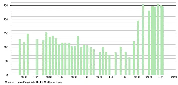 L'évolution du nombre d'habitants est connue à travers les recensements de la population effectués dans la commune depuis 1793. Pour les communes de moins de 10 000 habitants, une enquête de recensement portant sur toute la population est réalisée tous les cinq ans, les populations légales des années intermédiaires étant quant à elles estimées par interpolation ou extrapolation[18]. Pour la commune, le premier recensement exhaustif entrant dans le cadre du nouveau dispositif a été réalisé en 2004[19].