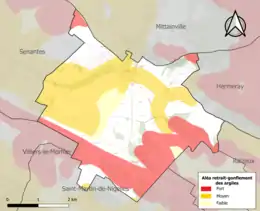 Le retrait-gonflement des sols argileux est susceptible d'engendrer des dommages importants aux bâtiments en cas d’alternance de périodes de sécheresse et de pluie. 60,1 % de la superficie communale est en aléa moyen ou fort (52,8 % au niveau départemental et 48,5 % au niveau national). Sur les 147 bâtiments dénombrés sur la commune en 2019, 111 sont en aléa moyen ou fort, soit 76 %, à comparer aux 70 % au niveau départemental et 54 % au niveau national. Une cartographie de l'exposition du territoire national au retrait gonflement des sols argileux est disponible sur le site du BRGM[18],[Carte 2].