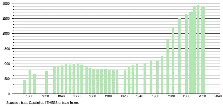 L'évolution du nombre d'habitants est connue à travers les recensements de la population effectués dans la commune depuis 1793. Pour les communes de moins de 10 000 habitants, une enquête de recensement portant sur toute la population est réalisée tous les cinq ans, les populations légales des années intermédiaires étant quant à elles estimées par interpolation ou extrapolation[22]. Pour la commune, le premier recensement exhaustif entrant dans le cadre du nouveau dispositif a été réalisé en 2004[23].
