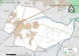 L'occupation des sols de la commune, telle qu'elle ressort de la base de données européenne d’occupation biophysique des sols Corine Land Cover (CLC), est marquée par l'importance des territoires agricoles (69,5 % en 2018), néanmoins en diminution par rapport à 1990 (85,3 %). La répartition détaillée en 2018 est la suivante : terres arables (46 %), zones urbanisées (24,3 %), zones agricoles hétérogènes (23,5 %), forêts (6,2 %)[23]. L'évolution de l’occupation des sols de la commune et de ses infrastructures peut être observée sur les différentes représentations cartographiques du territoire : la carte de Cassini (XVIIIe siècle), la carte d'état-major (1820-1866) et les cartes ou photos aériennes de l'IGN pour la période actuelle (1950 à aujourd'hui)[Carte 2].