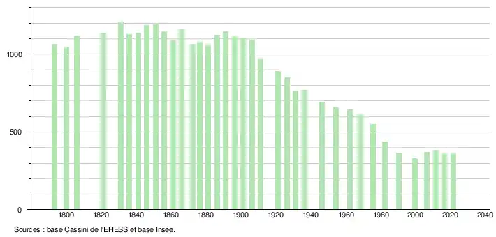 L'évolution du nombre d'habitants est connue à travers les recensements de la population effectués dans la commune depuis 1793. Pour les communes de moins de 10 000 habitants, une enquête de recensement portant sur toute la population est réalisée tous les cinq ans, les populations légales des années intermédiaires étant quant à elles estimées par interpolation ou extrapolation[25]. Pour la commune, le premier recensement exhaustif entrant dans le cadre du nouveau dispositif a été réalisé en 2006[26].