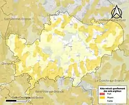 Le retrait-gonflement des sols argileux est susceptible d'engendrer des dommages importants aux bâtiments en cas d’alternance de périodes de sécheresse et de pluie[17]. 42,5 % de la superficie communale est en aléa moyen ou fort (27 % au niveau départemental et 48,5 % au niveau national métropolitain)[Carte 2]. Depuis le , en application de la loi ÉLAN, différentes contraintes s'imposent aux vendeurs, maîtres d'ouvrages ou constructeurs de biens situés dans une zone classée en aléa moyen ou fort[Note 3],[18].