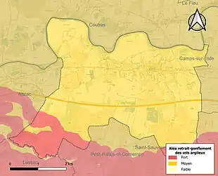 Le retrait-gonflement des sols argileux est susceptible d'engendrer des dommages importants aux bâtiments en cas d’alternance de périodes de sécheresse et de pluie. La totalité de la commune est en aléa moyen ou fort (67,4 % au niveau départemental et 48,5 % au niveau national). Sur les 1 158 bâtiments dénombrés sur la commune en 2019, 1 158 sont en aléa moyen ou fort, soit 100 %, à comparer aux 84 % au niveau départemental et 54 % au niveau national. Une cartographie de l'exposition du territoire national au retrait gonflement des sols argileux est disponible sur le site du BRGM[22],[Carte 2].