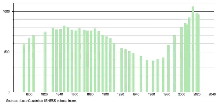 L'évolution du nombre d'habitants est connue à travers les recensements de la population effectués dans la commune depuis 1793. Pour les communes de moins de 10 000 habitants, une enquête de recensement portant sur toute la population est réalisée tous les cinq ans, les populations légales des années intermédiaires étant quant à elles estimées par interpolation ou extrapolation[14]. Pour la commune, le premier recensement exhaustif entrant dans le cadre du nouveau dispositif a été réalisé en 2004[15].