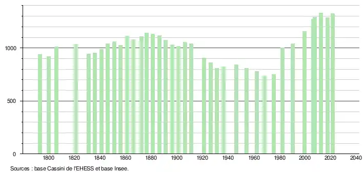 L'évolution du nombre d'habitants est connue à travers les recensements de la population effectués dans la commune depuis 1793. Pour les communes de moins de 10 000 habitants, une enquête de recensement portant sur toute la population est réalisée tous les cinq ans, les populations légales des années intermédiaires étant quant à elles estimées par interpolation ou extrapolation[21]. Pour la commune, le premier recensement exhaustif entrant dans le cadre du nouveau dispositif a été réalisé en 2007[22].