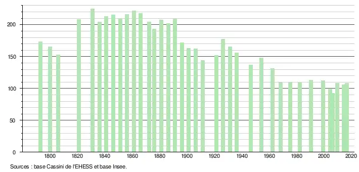 L'évolution du nombre d'habitants est connue à travers les recensements de la population effectués dans la commune depuis 1793. Pour les communes de moins de 10 000 habitants, une enquête de recensement portant sur toute la population est réalisée tous les cinq ans, les populations légales des années intermédiaires étant quant à elles estimées par interpolation ou extrapolation[4]. Pour la commune, le premier recensement exhaustif entrant dans le cadre du nouveau dispositif a été réalisé en 2004[5].