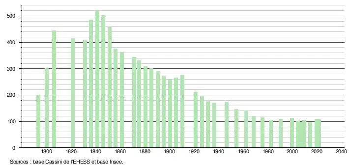 L'évolution du nombre d'habitants est connue à travers les recensements de la population effectués dans la commune depuis 1793. Pour les communes de moins de 10 000 habitants, une enquête de recensement portant sur toute la population est réalisée tous les cinq ans, les populations légales des années intermédiaires étant quant à elles estimées par interpolation ou extrapolation[18]. Pour la commune, le premier recensement exhaustif entrant dans le cadre du nouveau dispositif a été réalisé en 2004[19].