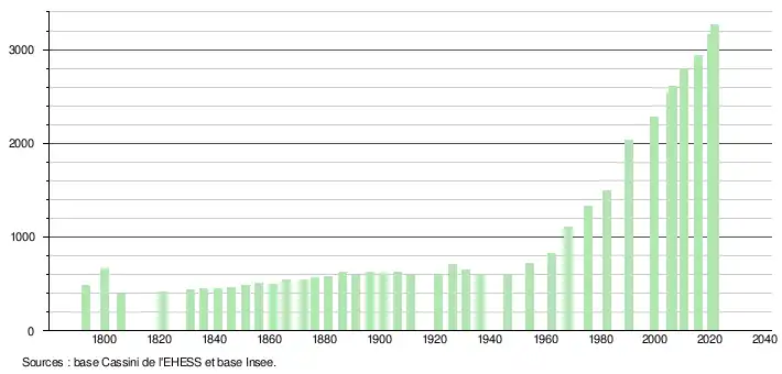 L'évolution du nombre d'habitants est connue à travers les recensements de la population effectués dans la commune depuis 1793. Pour les communes de moins de 10 000 habitants, une enquête de recensement portant sur toute la population est réalisée tous les cinq ans, les populations légales des années intermédiaires étant quant à elles estimées par interpolation ou extrapolation[25]. Pour la commune, le premier recensement exhaustif entrant dans le cadre du nouveau dispositif a été réalisé en 2005[26].