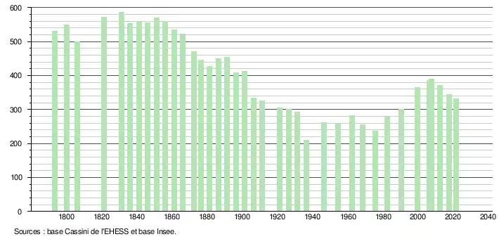 L'évolution du nombre d'habitants est connue à travers les recensements de la population effectués dans la commune depuis 1793. Pour les communes de moins de 10 000 habitants, une enquête de recensement portant sur toute la population est réalisée tous les cinq ans, les populations légales des années intermédiaires étant quant à elles estimées par interpolation ou extrapolation[49]. Pour la commune, le premier recensement exhaustif entrant dans le cadre du nouveau dispositif a été réalisé en 2007[50].