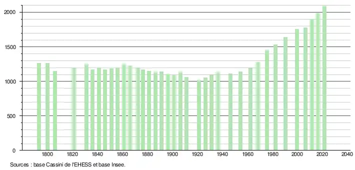 L'évolution du nombre d'habitants est connue à travers les recensements de la population effectués dans la commune depuis 1793. Pour les communes de moins de 10 000 habitants, une enquête de recensement portant sur toute la population est réalisée tous les cinq ans, les populations légales des années intermédiaires étant quant à elles estimées par interpolation ou extrapolation[36]. Pour la commune, le premier recensement exhaustif entrant dans le cadre du nouveau dispositif a été réalisé en 2006[37].
