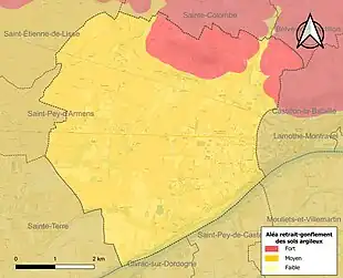 Le retrait-gonflement des sols argileux est susceptible d'engendrer des dommages importants aux bâtiments en cas d’alternance de périodes de sécheresse et de pluie. La totalité de la commune est en aléa moyen ou fort (67,4 % au niveau départemental et 48,5 % au niveau national). Sur les 984 bâtiments dénombrés sur la commune en 2019, 984 sont en aléa moyen ou fort, soit 100 %, à comparer aux 84 % au niveau départemental et 54 % au niveau national. Une cartographie de l'exposition du territoire national au retrait gonflement des sols argileux est disponible sur le site du BRGM[29],[Carte 2].