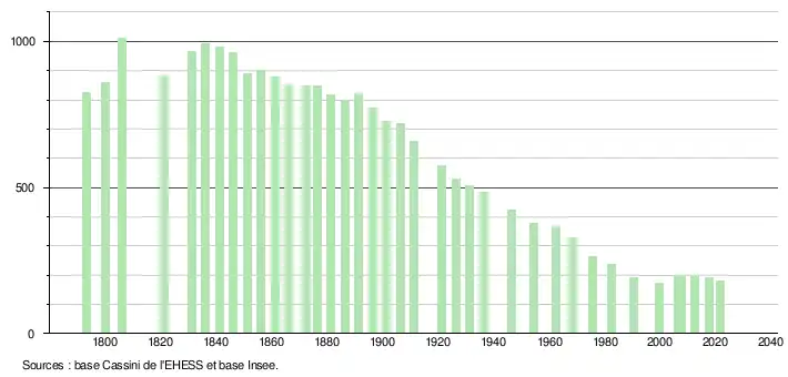 L'évolution du nombre d'habitants est connue à travers les recensements de la population effectués dans la commune depuis 1793. Pour les communes de moins de 10 000 habitants, une enquête de recensement portant sur toute la population est réalisée tous les cinq ans, les populations légales des années intermédiaires étant quant à elles estimées par interpolation ou extrapolation[25]. Pour la commune, le premier recensement exhaustif entrant dans le cadre du nouveau dispositif a été réalisé en 2007[26].