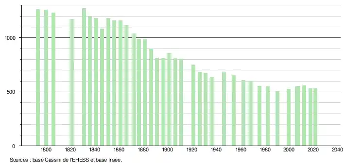 L'évolution du nombre d'habitants est connue à travers les recensements de la population effectués dans la commune depuis 1793. Pour les communes de moins de 10 000 habitants, une enquête de recensement portant sur toute la population est réalisée tous les cinq ans, les populations légales des années intermédiaires étant quant à elles estimées par interpolation ou extrapolation[17]. Pour la commune, le premier recensement exhaustif entrant dans le cadre du nouveau dispositif a été réalisé en 2007[18].