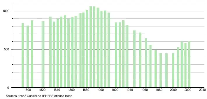L'évolution du nombre d'habitants est connue à travers les recensements de la population effectués dans la commune depuis 1793. Pour les communes de moins de 10 000 habitants, une enquête de recensement portant sur toute la population est réalisée tous les cinq ans, les populations légales des années intermédiaires étant quant à elles estimées par interpolation ou extrapolation[15]. Pour la commune, le premier recensement exhaustif entrant dans le cadre du nouveau dispositif a été réalisé en 2006[16].