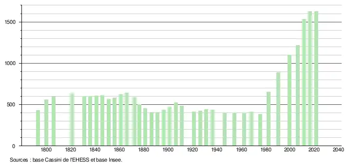 En 2021, la commune comptait 1 629 habitants[Note 4], en augmentation de 1,05 % par rapport à 2015 (Gard : +2,49 %, France hors Mayotte : +1,84 %).