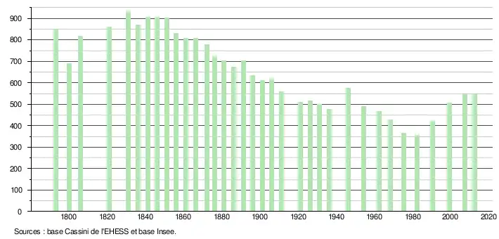 L'évolution du nombre d'habitants est connue à travers les recensements de la population effectués dans la commune depuis 1793. À partir du , les populations légales des communes sont publiées annuellement dans le cadre d'un recensement qui repose désormais sur une collecte d'information annuelle, concernant successivement tous les territoires communaux au cours d'une période de cinq ans. Pour les communes de moins de 10 000 habitants, une enquête de recensement portant sur toute la population est réalisée tous les cinq ans, les populations légales des années intermédiaires étant quant à elles estimées par interpolation ou extrapolation[7]. Pour la commune, le premier recensement exhaustif entrant dans le cadre du nouveau dispositif a été réalisé en 2007[8],[Note 2].