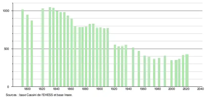 L'évolution du nombre d'habitants est connue à travers les recensements de la population effectués dans la commune depuis 1793. Pour les communes de moins de 10 000 habitants, une enquête de recensement portant sur toute la population est réalisée tous les cinq ans, les populations légales des années intermédiaires étant quant à elles estimées par interpolation ou extrapolation[23]. Pour la commune, le premier recensement exhaustif entrant dans le cadre du nouveau dispositif a été réalisé en 2005[24].