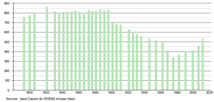 - Dans le tableau des recensements et le graphique, par convention dans Wikipédia, le principe a été retenu, pour les populations légales postérieures à 1999 de n’afficher dans le tableau des recensements et le graphique que les populations correspondant à l'année 2006, première population légale publiée calculée conformément aux concepts définis dans le décret no 2003-485 du 5 juin 2003, et les années correspondant à une enquête exhaustive de recensement pour les communes de moins de 10 000 habitants, ainsi que la dernière population légale publiée par l’Insee.