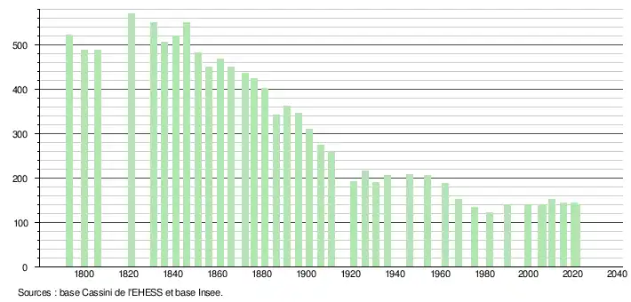 - Population municipale légale en vigueur au 1er janvier 2024, millésimée 2021, définie dans les limites territoriales en vigueur au 1er janvier 2023, date de référence statistique : 1er janvier 2021.