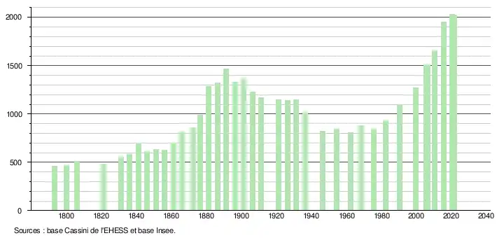 L'évolution du nombre d'habitants est connue à travers les recensements de la population effectués dans la commune depuis 1793. Pour les communes de moins de 10 000 habitants, une enquête de recensement portant sur toute la population est réalisée tous les cinq ans, les populations légales des années intermédiaires étant quant à elles estimées par interpolation ou extrapolation[35]. Pour la commune, le premier recensement exhaustif entrant dans le cadre du nouveau dispositif a été réalisé en 2005[36].