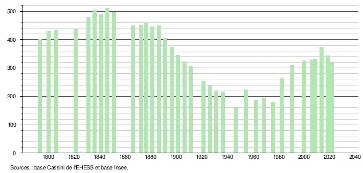 L'évolution du nombre d'habitants est connue à travers les recensements de la population effectués dans la commune depuis 1793. Pour les communes de moins de 10 000 habitants, une enquête de recensement portant sur toute la population est réalisée tous les cinq ans, les populations légales des années intermédiaires étant quant à elles estimées par interpolation ou extrapolation[17]. Pour la commune, le premier recensement exhaustif entrant dans le cadre du nouveau dispositif a été réalisé en 2008[18].