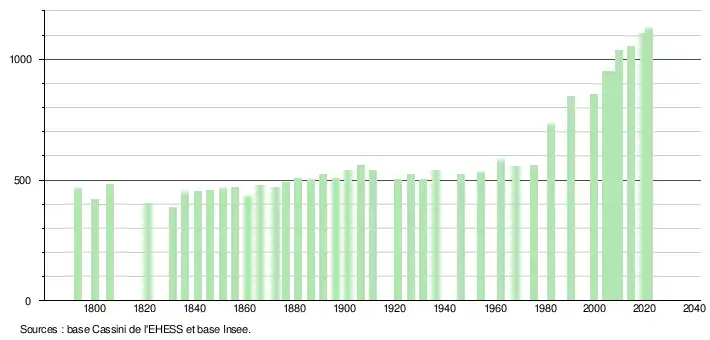 L'évolution du nombre d'habitants est connue à travers les recensements de la population effectués dans la commune depuis 1793. Pour les communes de moins de 10 000 habitants, une enquête de recensement portant sur toute la population est réalisée tous les cinq ans, les populations légales des années intermédiaires étant quant à elles estimées par interpolation ou extrapolation[31]. Pour la commune, le premier recensement exhaustif entrant dans le cadre du nouveau dispositif a été réalisé en 2004[32].