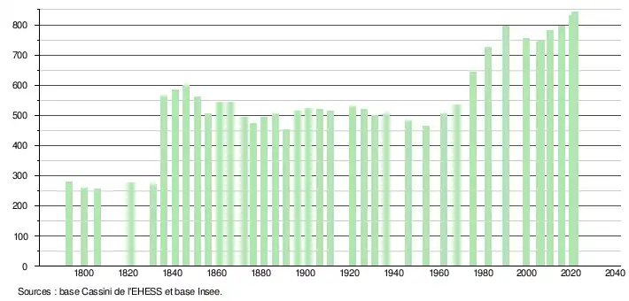 L'évolution du nombre d'habitants est connue à travers les recensements de la population effectués dans la commune depuis 1793. Pour les communes de moins de 10 000 habitants, une enquête de recensement portant sur toute la population est réalisée tous les cinq ans, les populations légales des années intermédiaires étant quant à elles estimées par interpolation ou extrapolation[20]. Pour la commune, le premier recensement exhaustif entrant dans le cadre du nouveau dispositif a été réalisé en 2005[21].