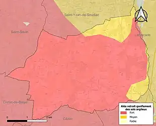 Le retrait-gonflement des sols argileux est susceptible d'engendrer des dommages importants aux bâtiments en cas d’alternance de périodes de sécheresse et de pluie. La totalité de la commune est en aléa moyen ou fort (67,4 % au niveau départemental et 48,5 % au niveau national). Sur les 631 bâtiments dénombrés sur la commune en 2019, 631 sont en aléa moyen ou fort, soit 100 %, à comparer aux 84 % au niveau départemental et 54 % au niveau national. Une cartographie de l'exposition du territoire national au retrait gonflement des sols argileux est disponible sur le site du BRGM[20],[Carte 2].