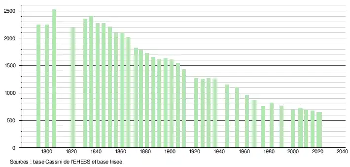 L'évolution du nombre d'habitants est connue à travers les recensements de la population effectués dans la commune depuis 1793. Pour les communes de moins de 10 000 habitants, une enquête de recensement portant sur toute la population est réalisée tous les cinq ans, les populations légales des années intermédiaires étant quant à elles estimées par interpolation ou extrapolation[24]. Pour la commune, le premier recensement exhaustif entrant dans le cadre du nouveau dispositif a été réalisé en 2005[25].