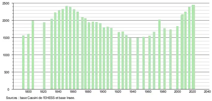 L'évolution du nombre d'habitants est connue à travers les recensements de la population effectués dans la commune depuis 1793. Pour les communes de moins de 10 000 habitants, une enquête de recensement portant sur toute la population est réalisée tous les cinq ans, les populations légales des années intermédiaires étant quant à elles estimées par interpolation ou extrapolation[27]. Pour la commune, le premier recensement exhaustif entrant dans le cadre du nouveau dispositif a été réalisé en 2005[28].