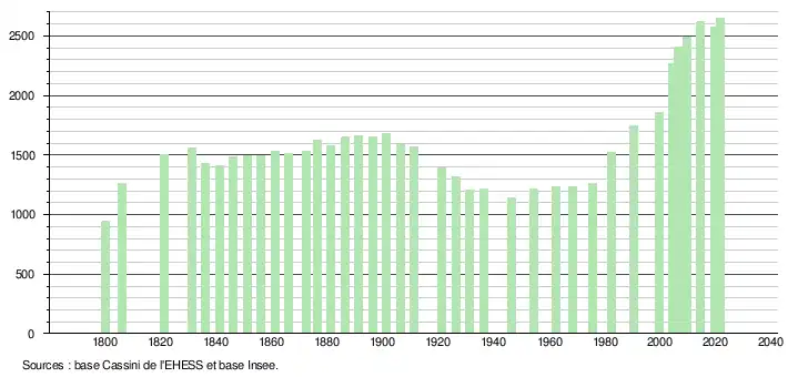 L'évolution du nombre d'habitants est connue à travers les recensements de la population effectués dans la commune depuis 1800. Pour les communes de moins de 10 000 habitants, une enquête de recensement portant sur toute la population est réalisée tous les cinq ans, les populations légales des années intermédiaires étant quant à elles estimées par interpolation ou extrapolation[22]. Pour la commune, le premier recensement exhaustif entrant dans le cadre du nouveau dispositif a été réalisé en 2004[23].