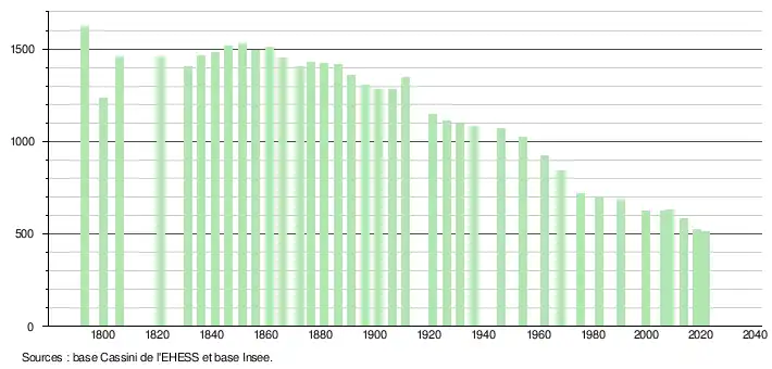 L'évolution du nombre d'habitants est connue à travers les recensements de la population effectués dans la commune depuis 1793. Pour les communes de moins de 10 000 habitants, une enquête de recensement portant sur toute la population est réalisée tous les cinq ans, les populations légales des années intermédiaires étant quant à elles estimées par interpolation ou extrapolation[21]. Pour la commune, le premier recensement exhaustif entrant dans le cadre du nouveau dispositif a été réalisé en 2008[22].