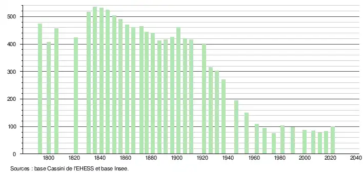 L'évolution du nombre d'habitants est connue à travers les recensements de la population effectués dans la commune depuis 1793. Pour les communes de moins de 10 000 habitants, une enquête de recensement portant sur toute la population est réalisée tous les cinq ans, les populations légales des années intermédiaires étant quant à elles estimées par interpolation ou extrapolation[25]. Pour la commune, le premier recensement exhaustif entrant dans le cadre du nouveau dispositif a été réalisé en 2006[26].