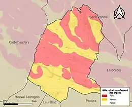Le retrait-gonflement des sols argileux est susceptible d'engendrer des dommages importants aux bâtiments en cas d’alternance de périodes de sécheresse et de pluie. La totalité de la commune est en aléa moyen ou fort (75,2 % au niveau départemental et 48,5 % au niveau national). Sur les 497 bâtiments dénombrés sur la commune en 2019, 497 sont en aléa moyen ou fort, soit 100 %, à comparer aux 94 % au niveau départemental et 54 % au niveau national. Une cartographie de l'exposition du territoire national au retrait gonflement des sols argileux est disponible sur le site du BRGM[24],[Carte 3].