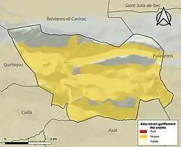 La commune est vulnérable au risque de mouvements de terrains constitué principalement du retrait-gonflement des sols argileux[33]. Cet aléa est susceptible d'engendrer des dommages importants aux bâtiments en cas d’alternance de périodes de sécheresse et de pluie. 77,1 % de la superficie communale est en aléa moyen ou fort (75,2 % au niveau départemental et 48,5 % au niveau national). Sur les 55 bâtiments dénombrés sur la commune en 2019, 55 sont en aléa moyen ou fort, soit 100 %, à comparer aux 94 % au niveau départemental et 54 % au niveau national. Une cartographie de l'exposition du territoire national au retrait gonflement des sols argileux est disponible sur le site du BRGM[34],[Carte 3].