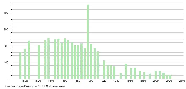 L'évolution du nombre d'habitants est connue à travers les recensements de la population effectués dans la commune depuis 1793. Pour les communes de moins de 10 000 habitants, une enquête de recensement portant sur toute la population est réalisée tous les cinq ans, les populations légales des années intermédiaires étant quant à elles estimées par interpolation ou extrapolation[44]. Pour la commune, le premier recensement exhaustif entrant dans le cadre du nouveau dispositif a été réalisé en 2006[45].