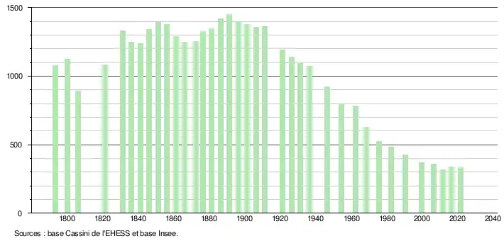 L'évolution du nombre d'habitants est connue à travers les recensements de la population effectués dans la commune depuis 1793. Pour les communes de moins de 10 000 habitants, une enquête de recensement portant sur toute la population est réalisée tous les cinq ans, les populations légales des années intermédiaires étant quant à elles estimées par interpolation ou extrapolation[24]. Pour la commune, le premier recensement exhaustif entrant dans le cadre du nouveau dispositif a été réalisé en 2006[25].