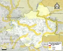 Le retrait-gonflement des sols argileux est susceptible d'engendrer des dommages importants aux bâtiments en cas d'alternance de périodes de sécheresse et de pluie. 19,6 % de la superficie communale est en aléa moyen ou fort (33,6 % au niveau départemental et 48,5 % au niveau national). Sur les 326 bâtiments dénombrés sur la commune en 2019, 29 sont en aléa moyen ou fort, soit 9 %, à comparer aux 25 % au niveau départemental et 54 % au niveau national. Une cartographie de l'exposition du territoire national au retrait gonflement des sols argileux est disponible sur le site du BRGM[17],[Carte 2].