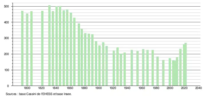 L'évolution du nombre d'habitants est connue à travers les recensements de la population effectués dans la commune depuis 1793. Pour les communes de moins de 10 000 habitants, une enquête de recensement portant sur toute la population est réalisée tous les cinq ans, les populations légales des années intermédiaires étant quant à elles estimées par interpolation ou extrapolation[23]. Pour la commune, le premier recensement exhaustif entrant dans le cadre du nouveau dispositif a été réalisé en 2004[24].