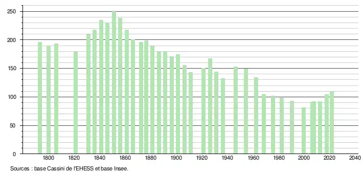 L'évolution du nombre d'habitants est connue à travers les recensements de la population effectués dans la commune depuis 1793. Pour les communes de moins de 10 000 habitants, une enquête de recensement portant sur toute la population est réalisée tous les cinq ans, les populations légales des années intermédiaires étant quant à elles estimées par interpolation ou extrapolation[17]. Pour la commune, le premier recensement exhaustif entrant dans le cadre du nouveau dispositif a été réalisé en 2007[18].